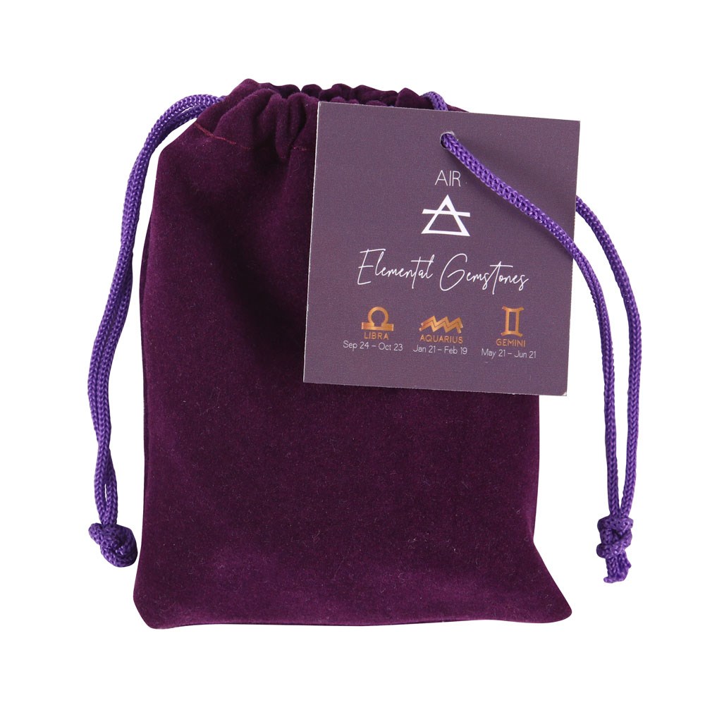H:12 x W:8 x D:2 cm – Aquarius, Gemini and Libra are signs ruled by the element of air and are known to be intellectual and highly social. This stunning set of 5 elemental tumblestones includes Lapis Lazuli for communication, Amethyst for energy, Labradorite for protection, Fluorite for intuition and Tiger Eye for improving mood. Beautifully presented in a protective velvet drawstring bag with hang tag and informative insert card. Part of the Four Elements range of celestial zodiac gifts and home decor.
