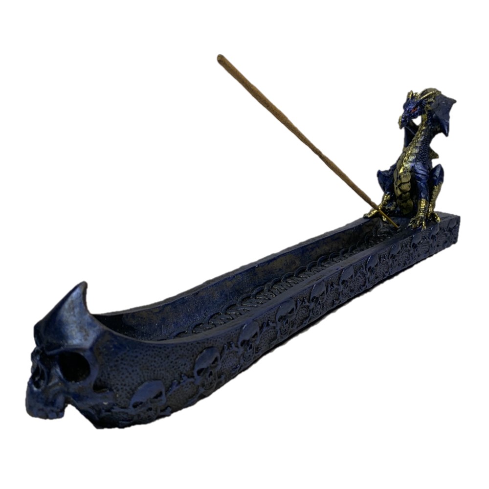 H:9.5 x W:31.5 x D:5.5 cm – Blue dragon perched on the end of a skull boat incense burner.