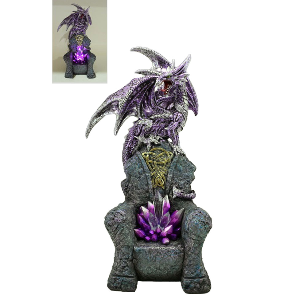 H:26.5 x W:14.5 x D:11.5 cm An intricate and impressive dragon on his thrown features glowing crystals which change colour. Beautiful to watch. Cast in the finest resin before being hand-painted. AA Batteries not included.