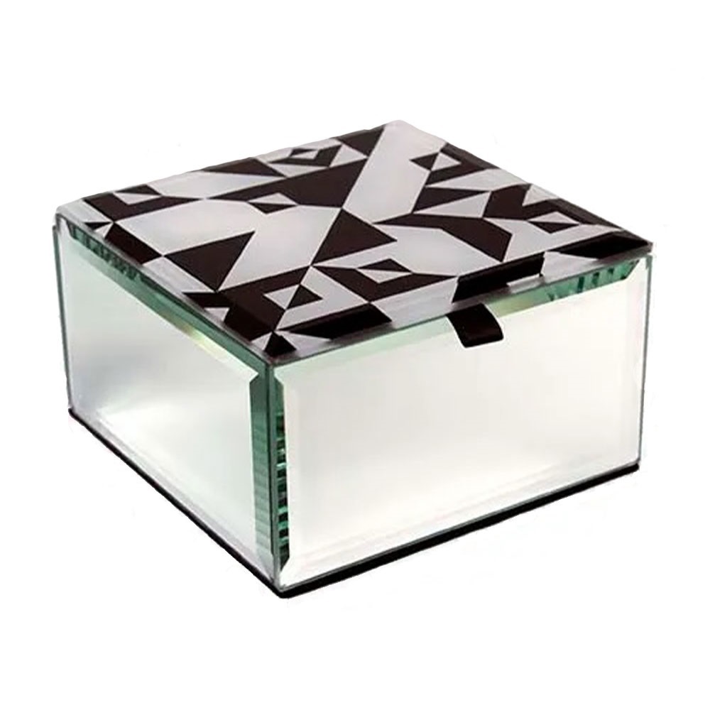 H:6.5 x W:11 x D:11.5 cm – Glass mirror patterned jewellery box with single storage area felt lined.