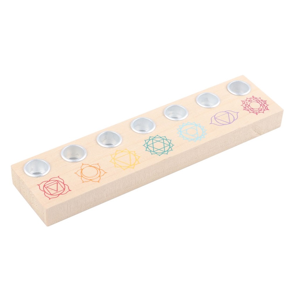 H:1.6 x W:17 x D:4.2 cm – Enhance any space with this beautiful Chakra Wooden Energy Candle Holder. Designed to hold seven taper candles, each representing one of the seven chakras of the body, this candle holder brings a sense of balance and serenity to the home. Made from light wood with small metal candle holders, it features the chakra colours in their corresponding order and is ideal for enhancing meditation practices or as a decorative piece. Candles are not included.
