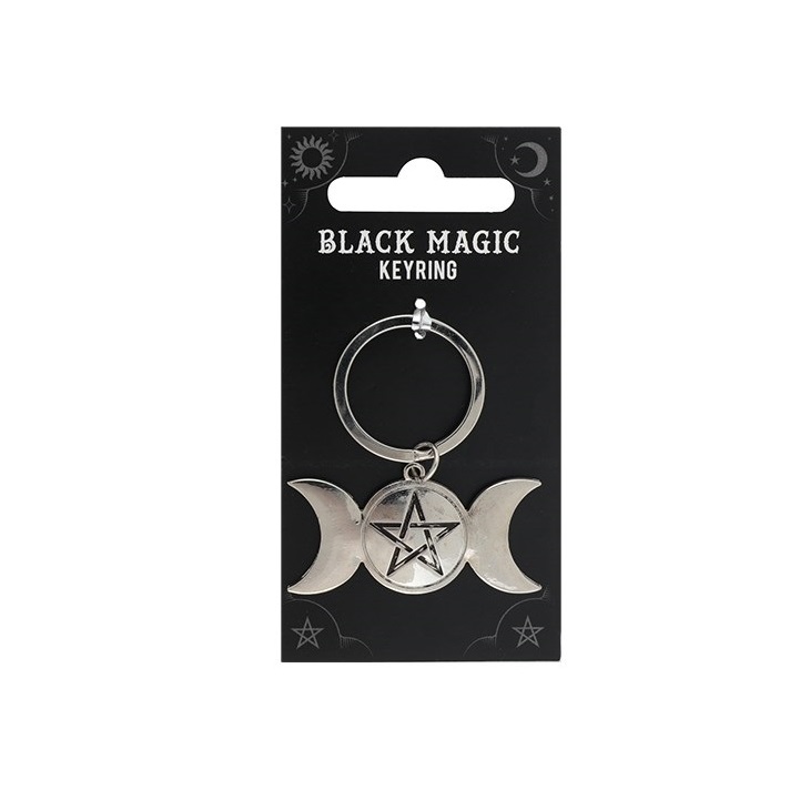 H:11 x W:5.5 x D:0.3 cm – 3 Min. Triple moon black magic keyring presented on a mystical backing card.