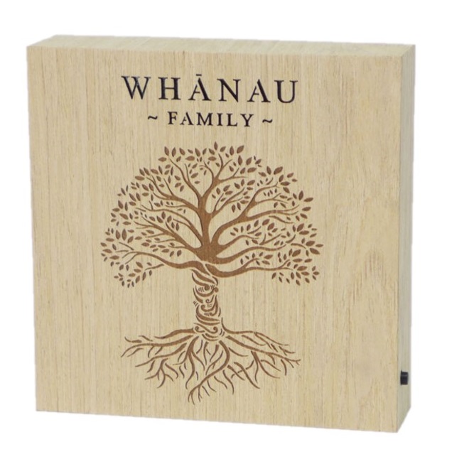 H:15 x W:15 x D:4 cm Natural Wooden LED Block. Whanau or Family. LED light is powered by 2 x AAA batteries, included in pack.