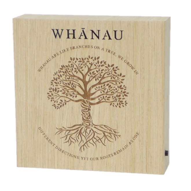 H:15 x W:15 x D:4 cm Natural Wooden LED Block with saying. Whanau are like branches on a tree, we grow in different directions, yet our roots remain as one. LED light is powered by 2 x AAA batteries, included in pack.