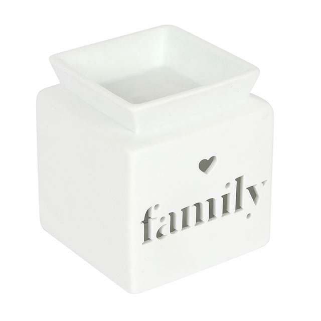 H:12x W:10 x D:10 cm – This white ceramic oil burner features a cut-out heart and ‘family’ text in a cute, contemporary design. Place fragrance oil or wax melts into the built-in dish with a standard tealight inside to fill the home with calming fragrance.