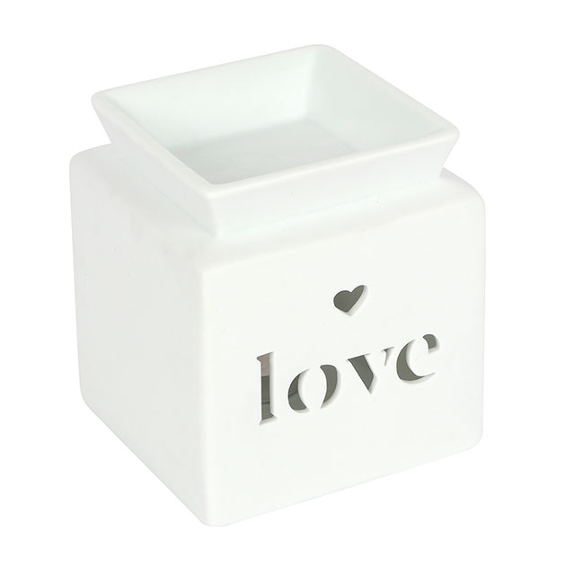 H:12 x W:10 x D:10 cm – This white ceramic oil burner features a cut-out heart and ‘love’ text in a cute, contemporary design. Place fragrance oil or wax melts into the built-in dish with a standard tealight inside to fill the home with calming fragrance.