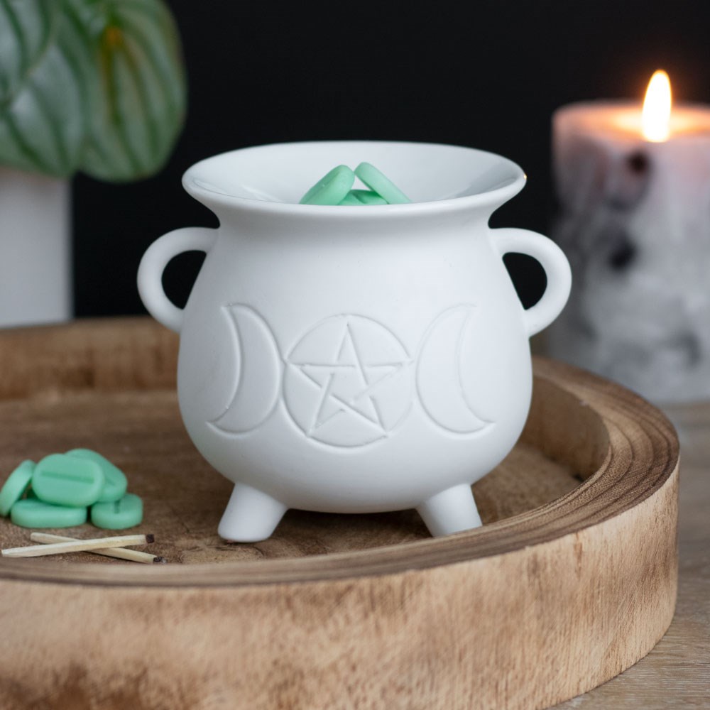 H:10 x W:13 x D:10.5 cm – A take on one of our all-time bestsellers! This white cauldron burner can be used to warm wax melts or diluted fragrance oils to beautifully fragrance the home. This white style features an engraved triple moon on the side and is part of the Black Magic range of gothic gifts and home decor.